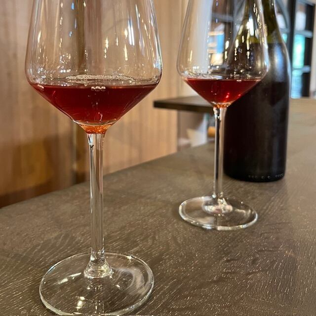 2023年は収穫量が上がり、質量共に充実したブドウなので初めての赤ワイン造りを行いました。これまでのスパークリングやロゼとは違い、皮や種の熟度と個性が反映される醸し発酵です。低温から高温まで様々な温度帯を経験させ、果皮の成分を余すところなく液体に移しました。約2週間でプレス。その後フレンチオークの3年使用樽という最もバランスが取れる樽を選び熟成を行いました。発酵終了直後は頼りなかった味わいが冬季の熟成中にグングン良くなりスタッフ一同驚きと少しの悔しさを感じたワインに仕上がりました。夏前に樽出し、瓶詰め。無清澄・無濾過。